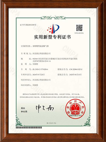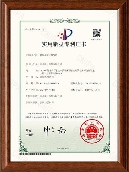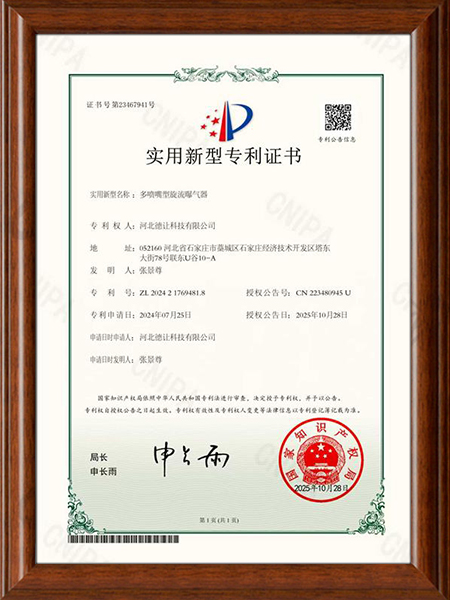 研发团队,积极开拓创新,已获取多项曝气器专利证书,其中新型研发的旋流曝气器,克服了传统曝气器易堵、易损、频繁更换等难点问题。
